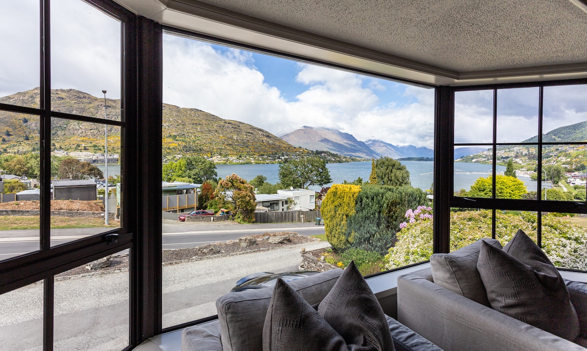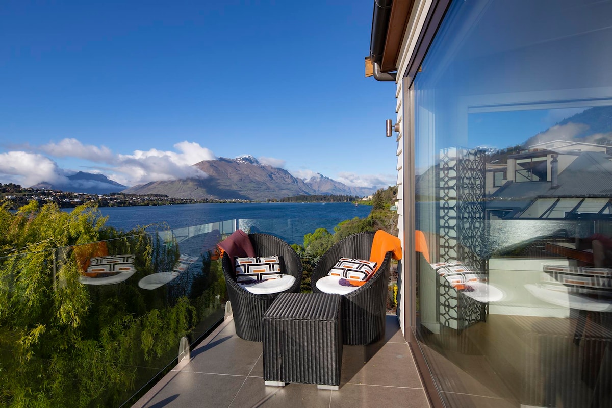 Casa no lago 1 – Vista para o lago, estacionamento, ar condicionado e lareira Relaxe nesta vila de luxo de dois andares com vistas deslumbrantes para o lago e a montanha, a apenas três minutos da orla e dos restaurantes de Queenstown. Desfrute de ar condicionado, uma lareira aconchegante, varanda privativa e sala de estar moderna em plano aberto. Base de verão perfeita para casais, famílias ou pequenos grupos explorarem passeios de vinho, aventuras no lago, trilhas de bicicleta, golfe e a vibrante cena gastronômica de Queenstown.