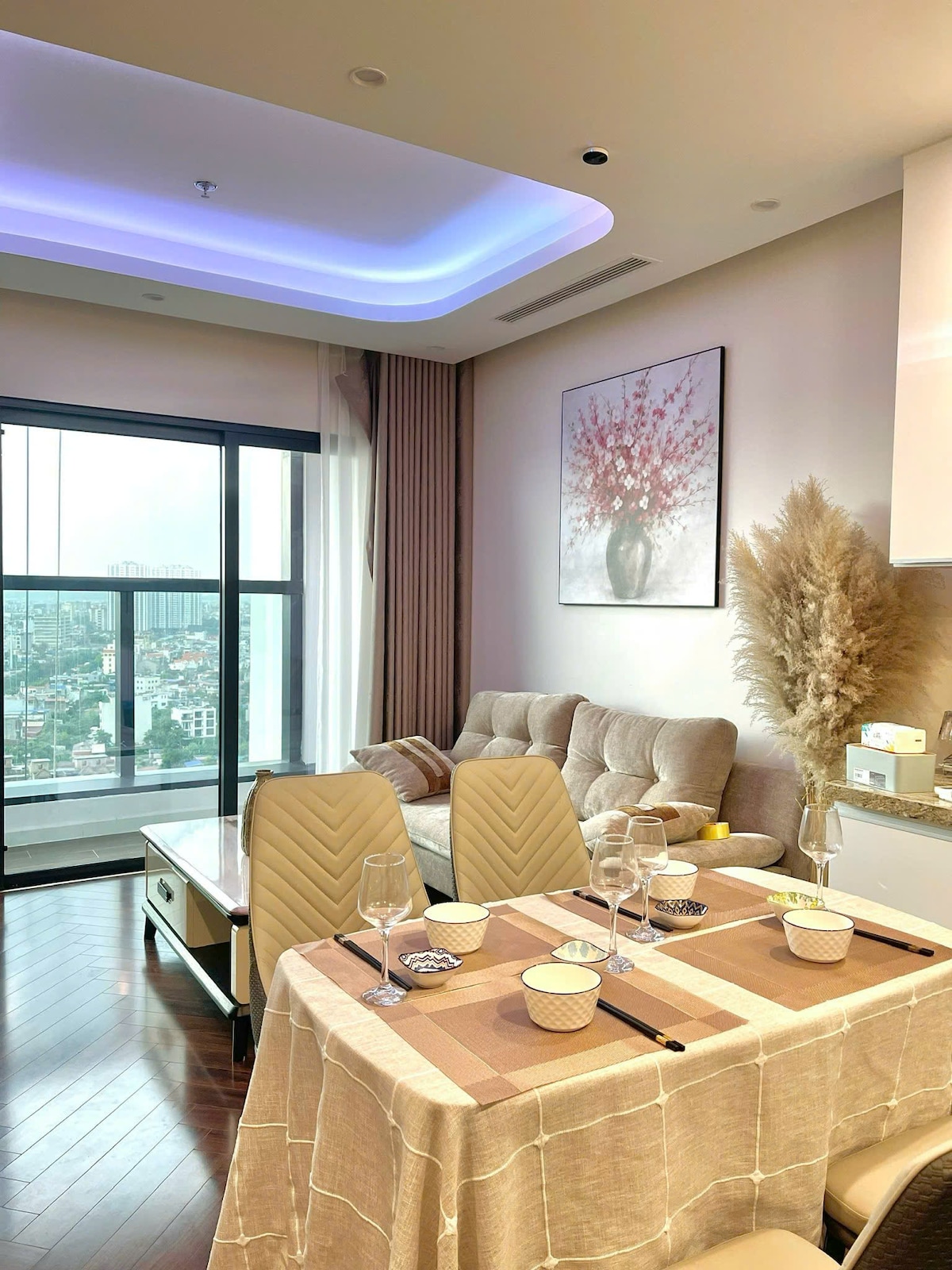 Apartamento de 1 quarto 56 m² para alugar, mobiliário completo, vista para a cidade – Wi-Fi gratuito Área: 56 m², 1 sala de estar, 1 banheiro novo 1 cama 1m8 colocada no quarto principal 1 cama extra 1m2 localizada na sala de estar Comodidades completas: Máquina de lavar roupa, ventilador elétrico Cozinha totalmente abastecida + especiarias básicas TV de 65", conta Netflix completa Ar condicionado de 2 vias Louça completa, toalhas, xampu – gel de banho Internet: Wi-Fi gratuito Vista: vista aberta e bonita da cidade Requintado: móveis e equipamentos 100% novos