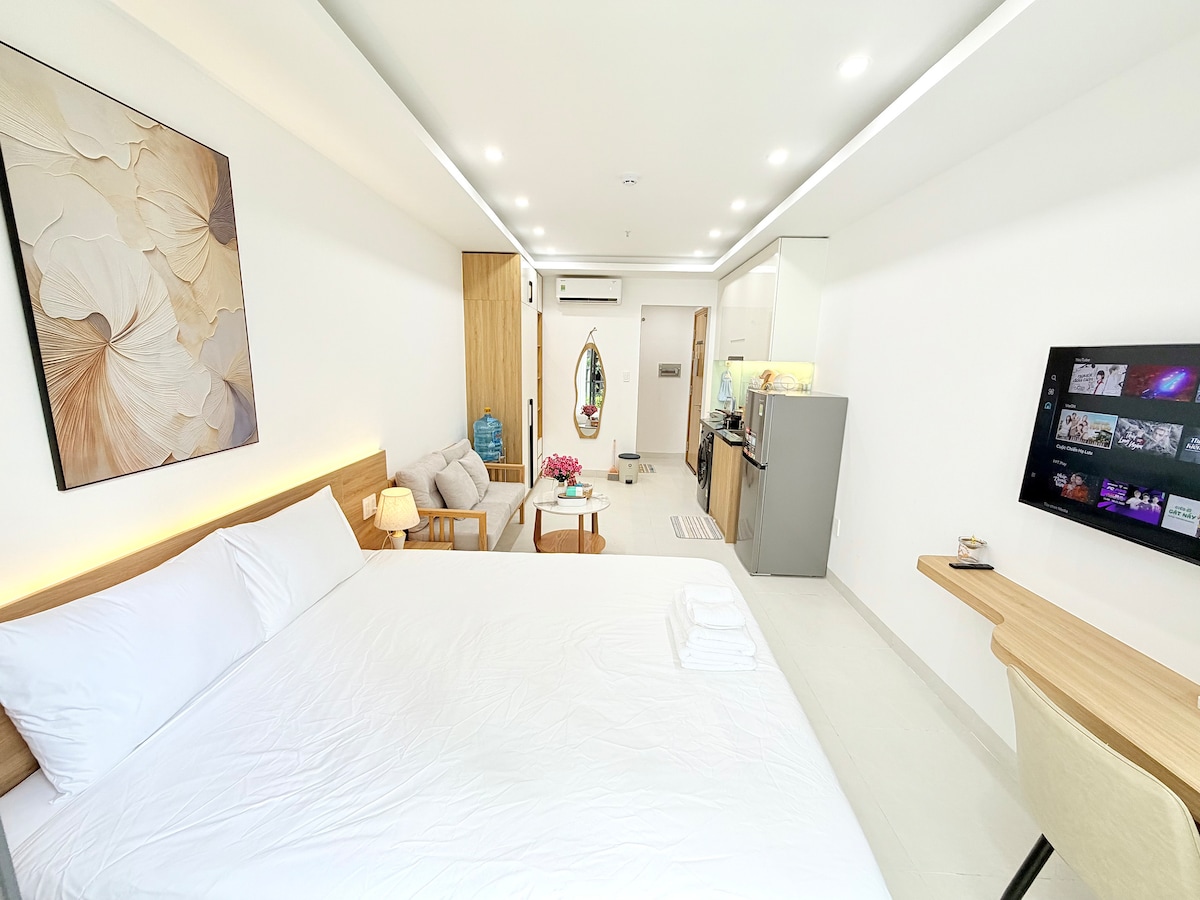 🌟Căn hộ studio ngập tràn ánh sáng tự nhiên ☀️, mang lại cảm giác thoáng đãng và dễ chịu ngay khi bước vào 🍃. Mọi góc nhỏ đều được chăm chút chỉn chu – từ bàn làm việc dài sát tường đến chiếc giường rộng rãi cạnh cửa sổ. Ban công nhỏ xinhvà cửa sổ mở rộng giúp căn phòng luôn mát mẻ, đón gió trời trong lành. Căn hộ đã được trang bị đầy đủ nội thất – chỉ cần xách vali đến và tận hưởng cuộc sống 🌷💗🌿