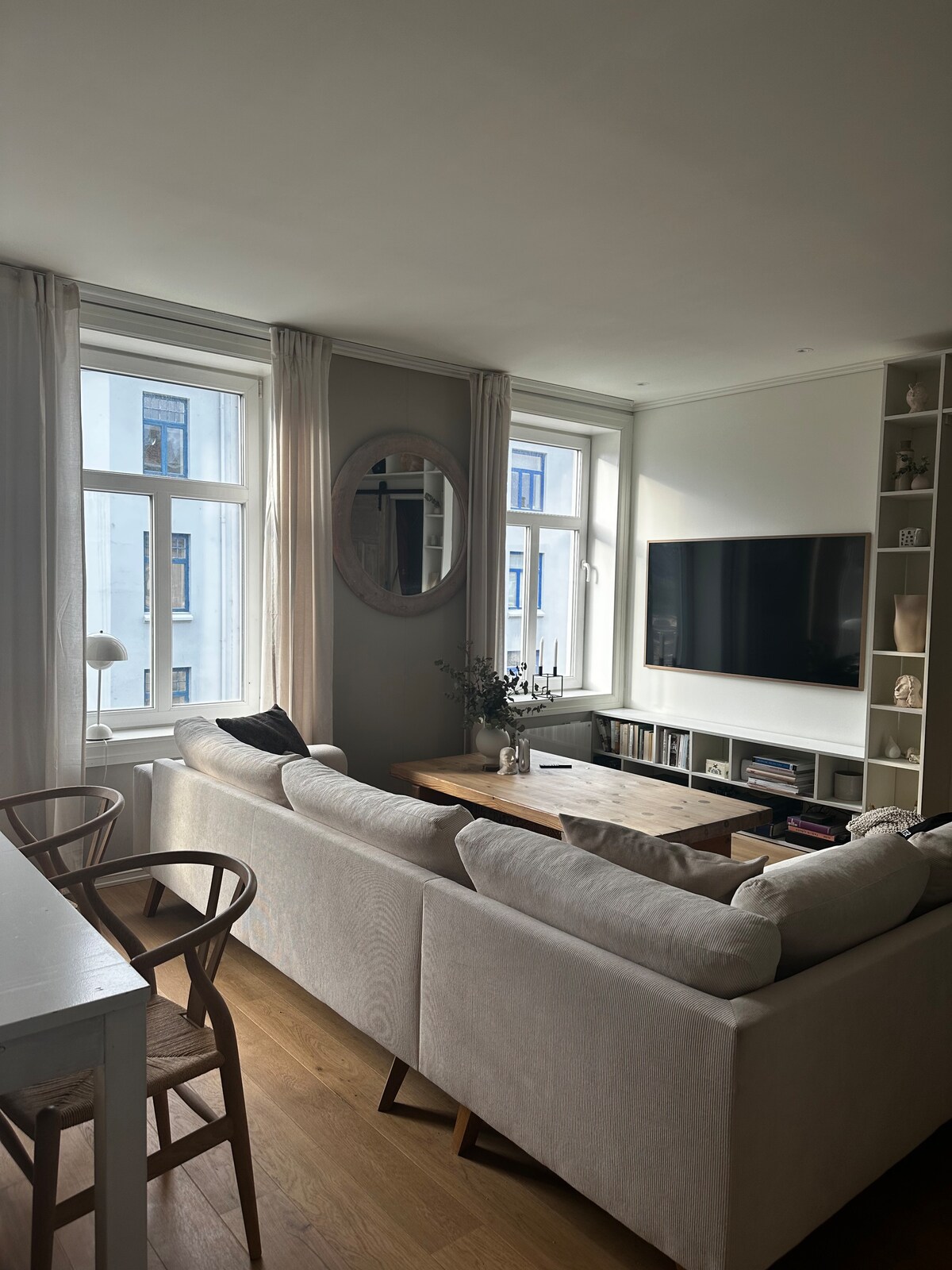 O apartamento fica no 3º andar. Perfeitamente localizado a cerca de 5 minutos a pé de Trondheim Torg, Øya/Nidelven e do mar. No interior, é exclusivamente projetado com parede curva e janela oval na sala de estar. 66 m², espaçoso com tetos altos e quartos de 17 m². Banheiro de bom tamanho. Mobiliado com uma mistura de móveis retrô clássicos e móveis modernos. A sala de estar tem uma bela vista para Steinåsen. Excelente acesso ao transporte público, com curta viagem de ônibus para, por exemplo, Bymarka ou Solsiden.