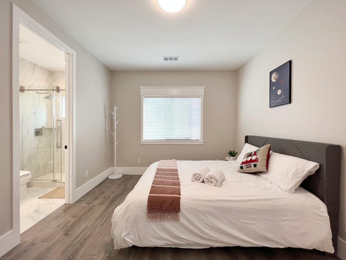 Uma suíte alegre com dois quartos e cada quarto com seu banheiro privativo, sua própria cozinha e sala de estar, nova máquina de lavar e secar roupa, garagem de dois carros para seu estacionamento gratuito! Suíte independente no primeiro andar da casa. Suíte térrea com garagem anexada. Sofá na sala de estar é reversível para uma cama de infiltração. Wi-Fi de alta velocidade, TV Roku, geladeira, forno de fogão, micro-ondas, torradeira, chaleira de água, utensílios de cozinha, lavadora e secadora, secador de cabelo também são fornecidos.