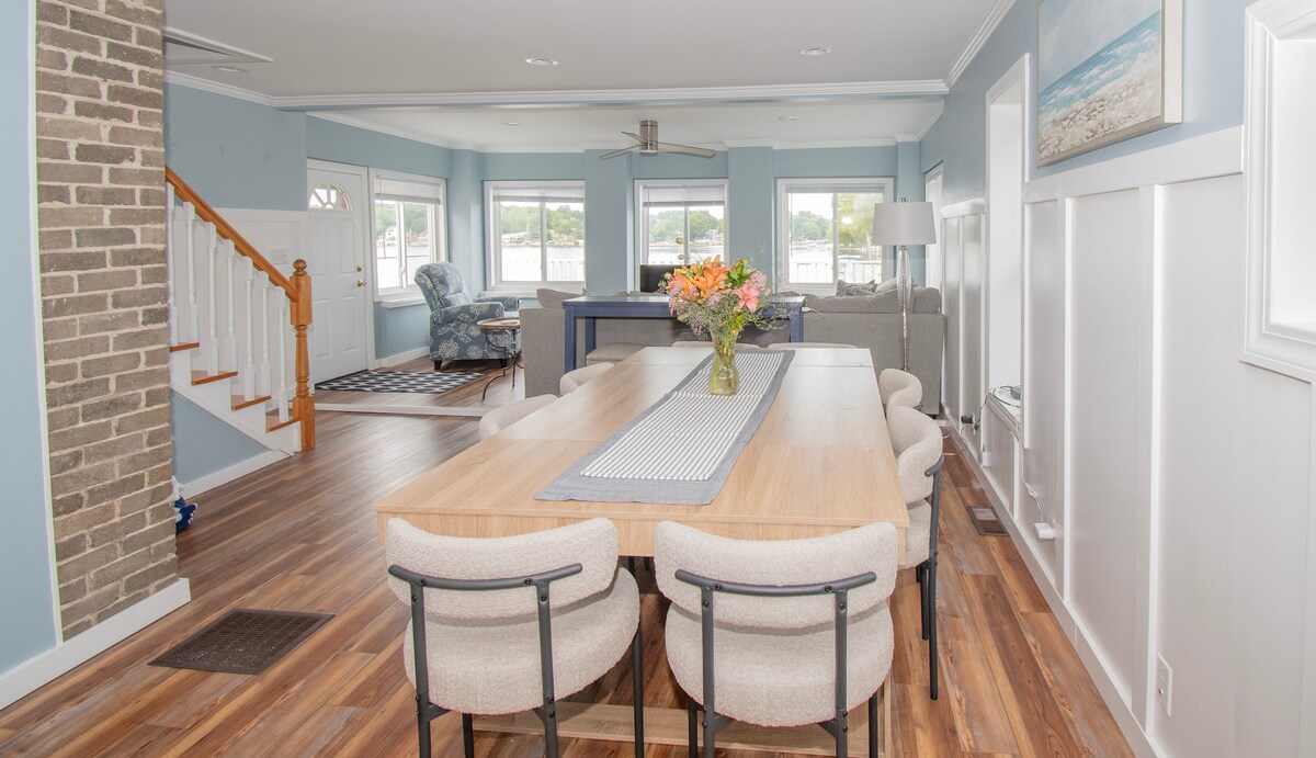 Bem-vindo ao lago! Experimente esta nova e totalmente remodelada Luxuosa Lake Home, que possui 65 pés de fachada do lago, acomoda até 15 hóspedes e o interior foi completamente refeito para recebê-lo em um refúgio deslumbrante e tranquilo no lago. Tome seu café da manhã no belo envoltório ao redor do deck e, em seguida, vá para a espaçosa área de praia para relaxar, pular no lago, desfrutar de caiaques, barco a remo e uma rampa de barco conveniente (para barcos menores!) diretamente da nossa garagem!
