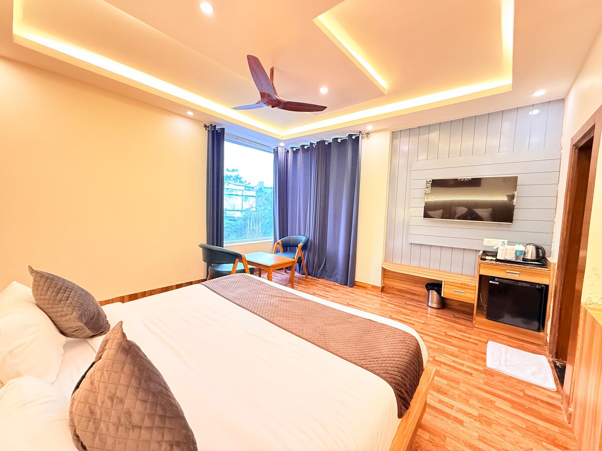 O Quarto Premium perto do Circuito Internacional de Budh oferece decoração elegante, móveis macios, comodidades modernas e vistas deslumbrantes, proporcionando um retiro perfeito para entusiastas de corridas e viajantes que buscam luxo e conforto.
