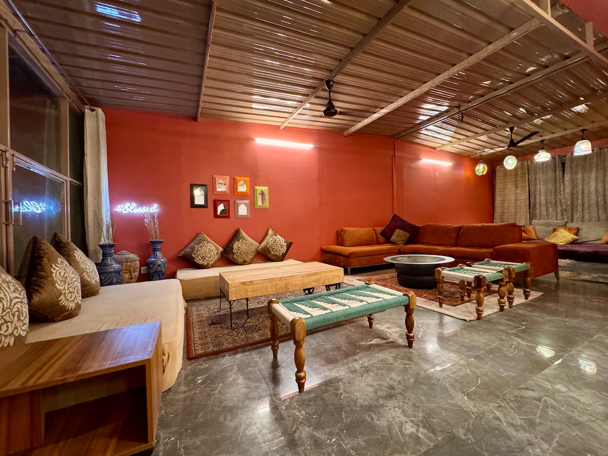 ◆ Located near Noida's popular malls, this pet-friendly 3-BHK farm villa offers a refreshing escape with a private pool, outdoor bar, and a laid-back atmosphere. ◆ With modern amenities, it features a stylish living space, a serene outdoor seating area, three cosy bedrooms, and a charming garden with a dedicated picnic spot. ◆ For added fun, enjoy outdoor sports with equipment like an exercise bike, bicycle, trampolines, and a TT table in the garden.