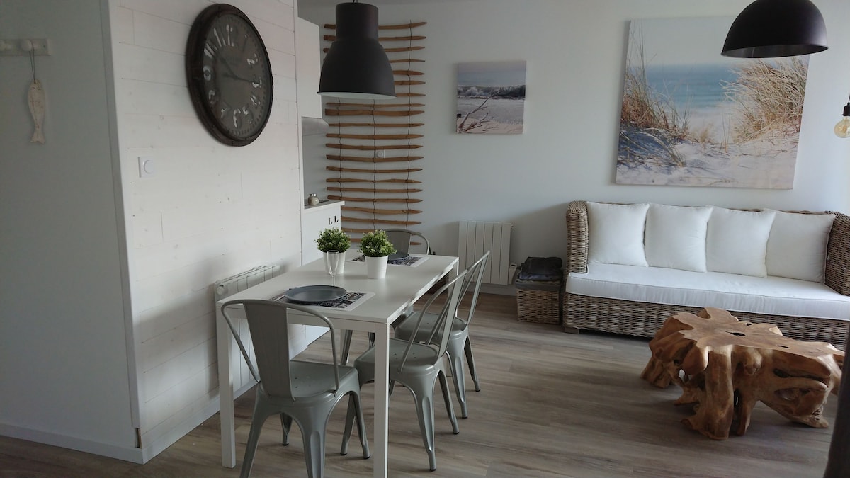 Nous vous accueillons dans ce logement 3 pièces de 40m² , pouvant accueillir 4 pers. (6 en dépliant le canapé convertible du salon) dans 2 chambres (un lit 160, et 2 lits superposés).Très bien situé, et bien équipé (four, lave vaisselle), vous serez à 700m de la plage de Bonne Source, à 700m du marché, et proche de toutes les animations sportives et festives de Pornichet. La terrasse extérieure exposée Sud vous permettra de profiter d'un repas au soleil. Lit, équipements et jeux bébé/enfants.