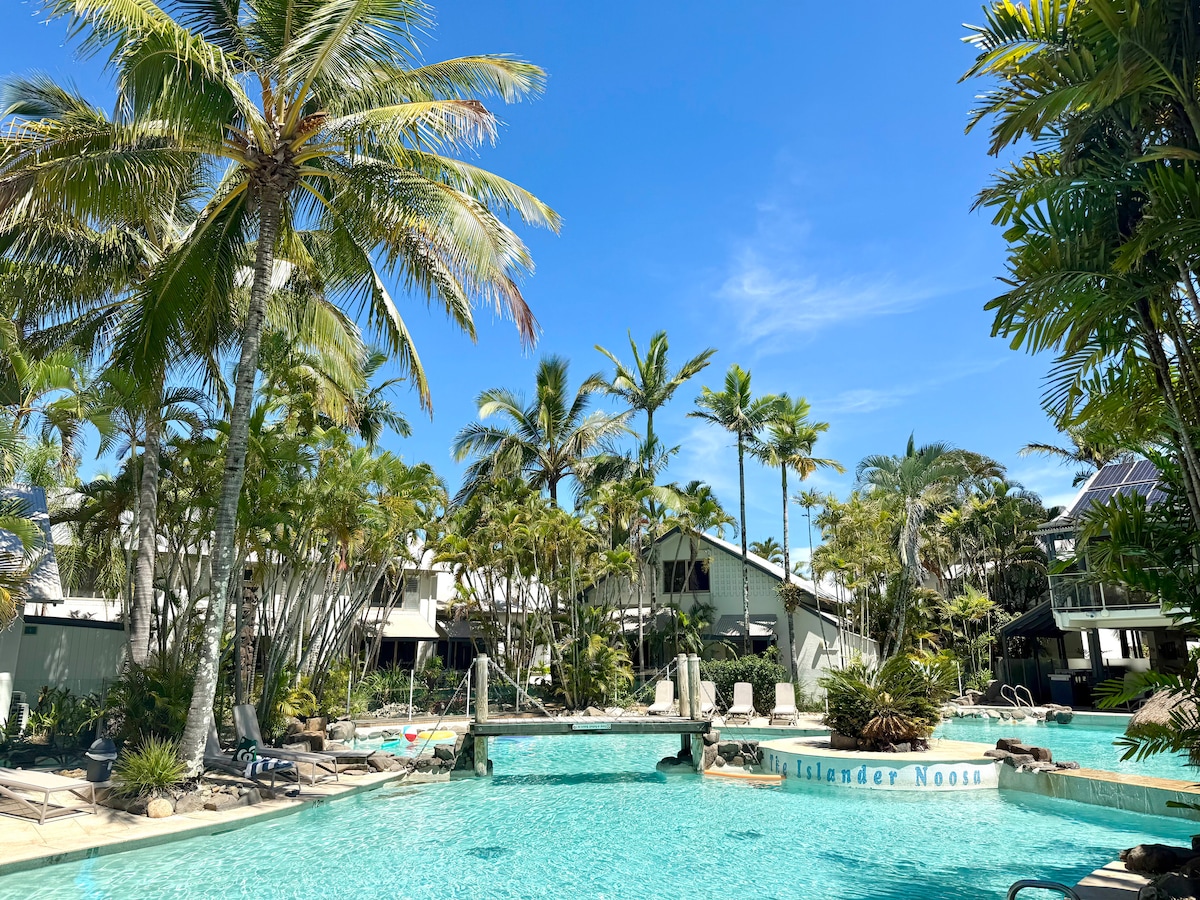 ☀️Oferta especial de inverno – maio/junho: fique 3 noites ou mais e ganhe 10% de desconto Espaço de estúdio de férias fresco e luminoso com vista para as 3 maiores piscinas da lagoa em Noosa. Localizado no belo rio de Noosa. Uma localização ideal, diretamente em frente à Noosa Marina/Ferry, a uma curta distância de carro da Hastings Street/Noosa Main Beach/Noosa Heads (10 min). Descontraia e relaxe no seu deck ou na área de jardins tropicais e piscinas do resort Champanhe complementar e pão fresco. Perfeito para 1 casal ou viajantes solteiros.