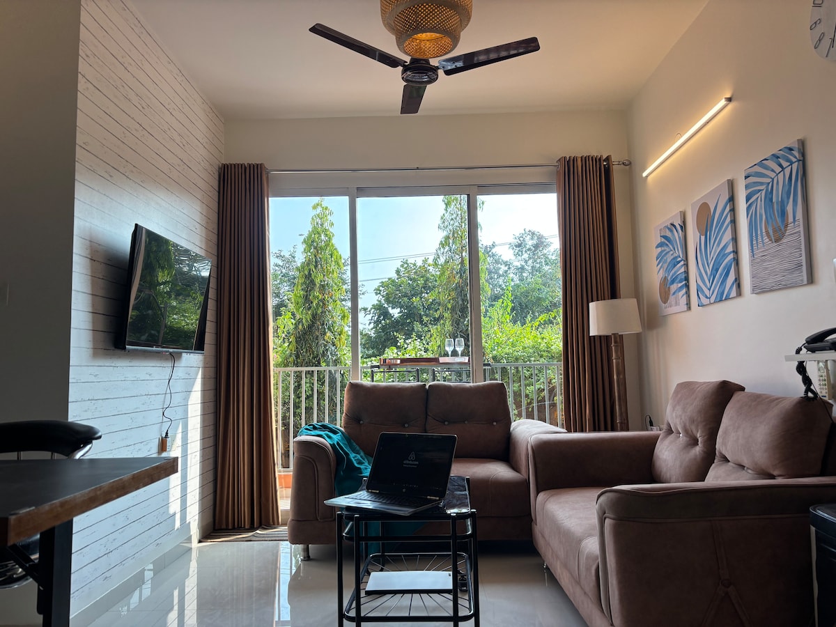 Escondido na encantadora e verde aldeia de Siolim, este apartamento de 1 quarto cuidadosamente projetado oferece a mistura perfeita de conforto, estilo e serenidade para viajantes que procuram uma verdadeira experiência em Goa. Se você é um casal em uma viagem romântica, um explorador solo ou um nômade digital, este espaço aconchegante foi projetado para ajudá-lo a relaxar e recarregar as energias. O apartamento faz parte de uma comunidade fechada com segurança 24 horas, piscina e paisagismo exuberante. O Wi-Fi de alta velocidade facilita a estadia