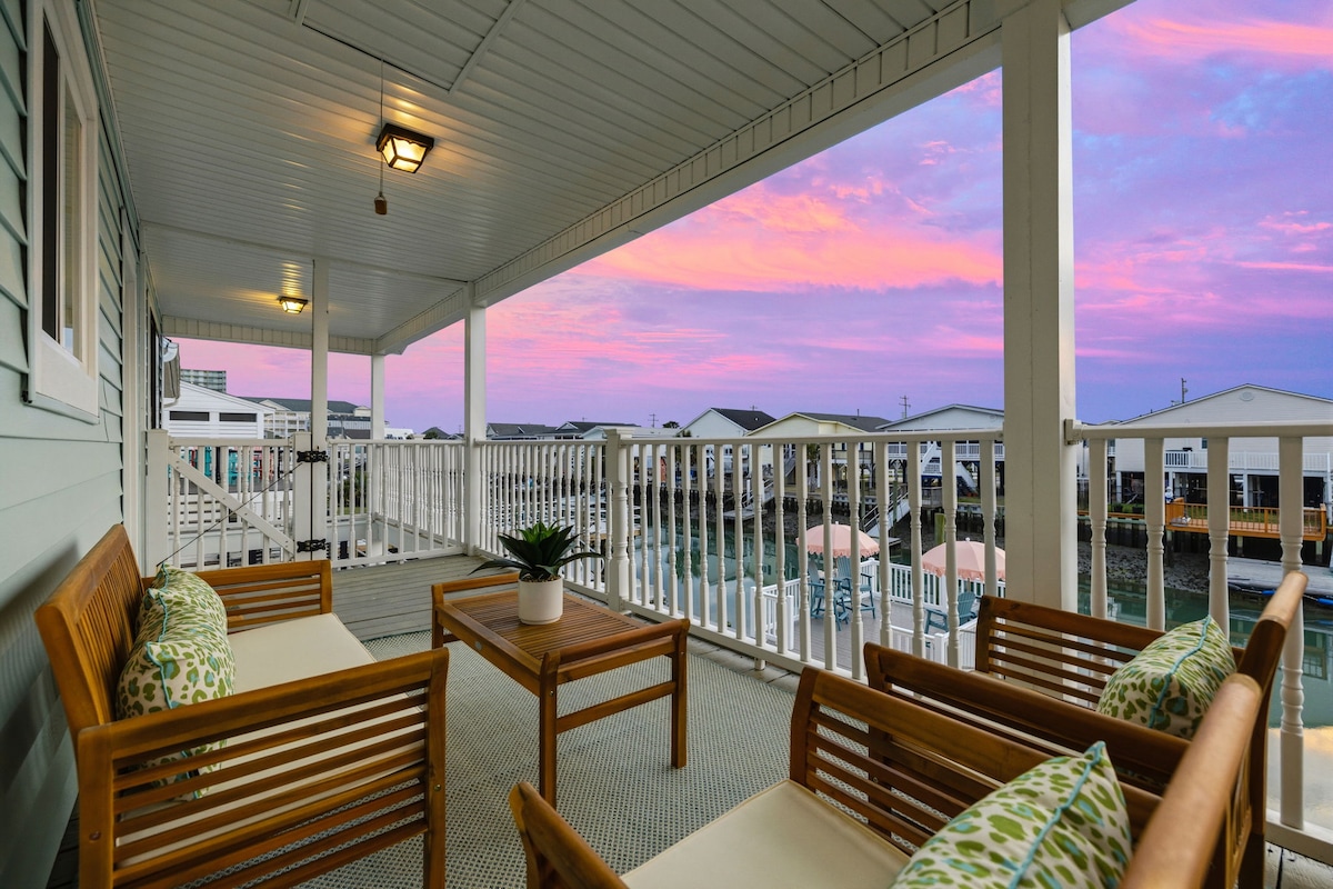 Casa de praia flutuante Cherry Grove Uma experiência de férias atemporal que traz de volta os momentos de relaxamento e felicidade. Casa de 4 quartos completamente renovada com vibração clássica de bangalô de praia, ótimas vistas para o mar: *Jacuzzi *Deck de 93 m² com 2 andares *100 pés da praia do outro lado da rua *Jogo de mini-golfe no quintal privado *Cafeteira Nespresso *Copos de bebida inovadores *Jogos de tabuleiro *Roupas de cama e limpeza *Balcões de quartzo *Distância a pé do píer, lojas, restaurantes *CRÉDITO DE CARRINHO DE GOLFE (estadia mínima)