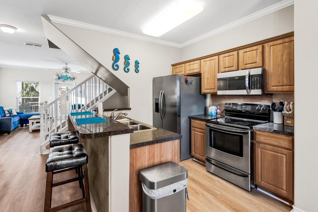Experimente uma escapada serena neste estúdio recém-remodelado no primeiro andar em North Padre Island, a apenas 5 minutos a pé da praia. Esta casa de campo acolhedora apresenta um design atemporal e bonito, incluindo uma cama king size e um sofá-cama queen size que acomoda até 4 hóspedes. Você também desfrutará de uma cozinha completa, banheiro, sala de jantar e estar com TV 4K. Há muitas comodidades de condomínio compartilhadas para incluir piscina, banheira de hidromassagem, sauna, academia, churrasqueira e muito mais. Desfrute de uma escapada serena na praia hoje!