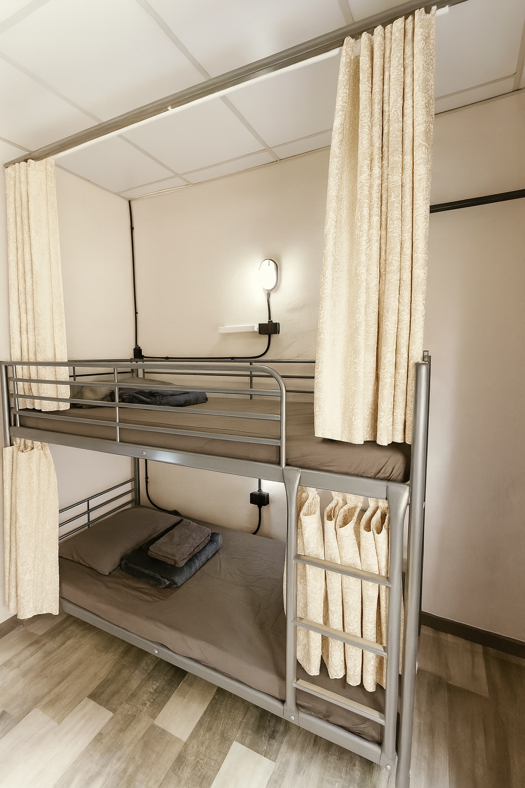 Dormitório confortável e bem projetado para uma estadia compartilhada melhor Nosso dormitório misto de 8 camas foi cuidadosamente projetado para viajantes que buscam o aspecto social de um hostel, sem abrir mão do conforto ou da qualidade do sono. Cada beliche está equipado com cortinas para privacidade, uma luz de leitura pessoal e tomadas individuais, proporcionando a você seu próprio espaço para descansar e recarregar as energias. Com colchões de alta qualidade e instalações limpas e bem conservadas, você desfrutará de um nível de conforto superior ao de estadias comuns em dormitórios.