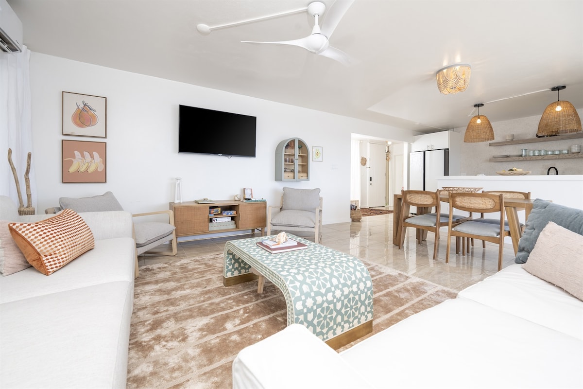 Apartamento no último andar, com vista para o mar, interiores de designer, 3 varandas, ar-condicionado completo, vibrações tranquilas e conforto sofisticado. Desfrute de uma cozinha totalmente equipada, W/D e itens essenciais de praia, como cadeiras de praia, toalhas e um refrigerador. 5 minutos para Magens Bay. Localizado em Mahogany Run fechado com acesso à piscina e segurança 24h. Cada quarto se abre para sua própria varanda. Wi-Fi rápido com espaço de trabalho dedicado. Ideal para casais e famílias que procuram uma escapada cênica, segura e totalmente equipada na ilha. Gerador de backup para sua tranquilidade.