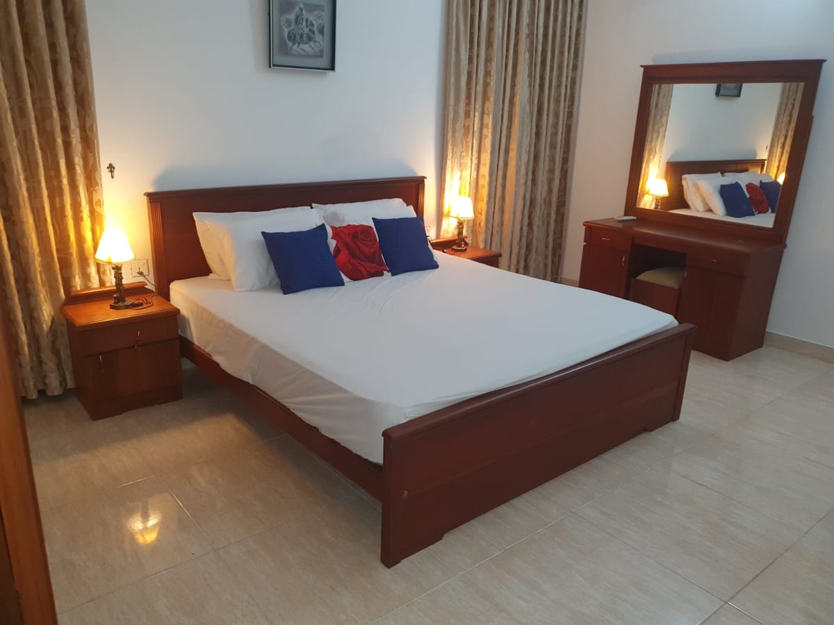 Linda unidade de estilo apartamento ideal para conforto e relaxamento para até 2 hóspedes. SLTDA registrado. Fica na Beach Road, Mount Lavinia, a 100 metros da famosa praia de Mount Lavinia. Todas as lojas, bancos, restaurantes estão a uma curta distância a pé. O quarto tem um banheiro anexo, cozinha e espaço para refeições, dando uma vibe de apartamento estúdio. Está no 1º andar da nossa casa com acesso para hóspedes através de uma escada externa dentro da propriedade. Os anfitriões estão sempre disponíveis no térreo.