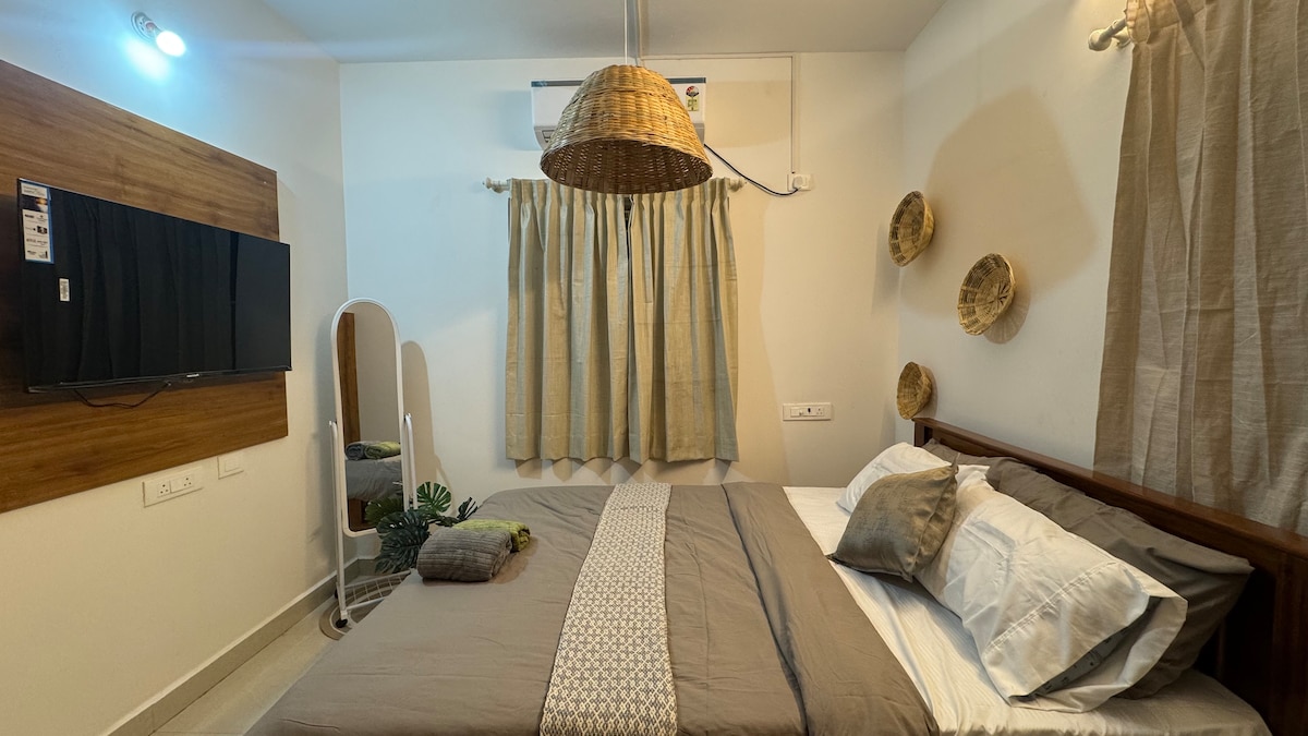 Estadia pronta para monções com backup de energia e sem alagamento na rua 🎬 HomeTheatre privado com projetor FireTV + sistema de som 🏖 5 minutos a pé da praia e perto dos escritórios da OMR IT 🌐 Wi-Fi de alta velocidade + espaço de trabalho dedicado + backup do inversor 🛏 Acomoda 4 confortavelmente (cama de casal + colchão de chão) ❄️ Mobiliado: ar-condicionado, aquecedor, geladeira, máquina de lavar roupa, fogão de indução, água RO e self check-in 👥 Perfeito para casais, amigos, famílias pequenas, funcionários da OMR IT, NRIs, viajantes de negócios e hóspedes internacionais