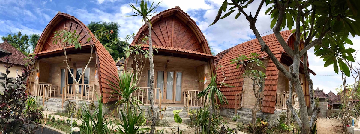 Bem-vindos aos nossos bangalôs fofos. Vamos dar as boas-vindas no calor da família Apit Lawang. Temos cinco bangalôs muito bonitos com instalações muito luxuosas e completas. Estamos localizados no meio da ilha central de Nusa Penida e perto da praia. Nossa acomodação tem um conceito natural. Em nosso lugar, você verá animais como cães, gatos, vacas, galinhas, pássaros e patos. Todas as manhãs você pode ouvir o som de galinhas cantando e o som de pássaros. Vamos explorar a Ilha Penida conosco.