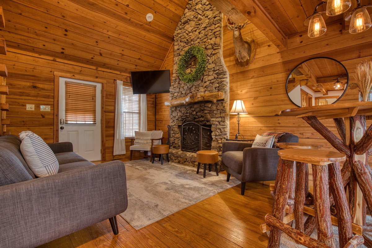 Locatários mensais bem-vindos — Cabana moderna bonita, para 2-4 pessoas, banheira de hidromassagem, lareira. A propriedade tem acesso a campo de golfe, clubhouse, piscina externa com vista para o Smoky Mtns, Fitness Center. 1 cama king 1 cama queen size, com sofá-cama para dormir um total de 6. Floresta privada atrás da propriedade. Mesa de air hockey lá embaixo. Varanda com tela. Lareira externa. TV e internet de alta velocidade são fornecidas sem custo. Conveniente para as Grandes Montanhas Fumegantes, Cades Cove, Dollywood e Gatlinburg.