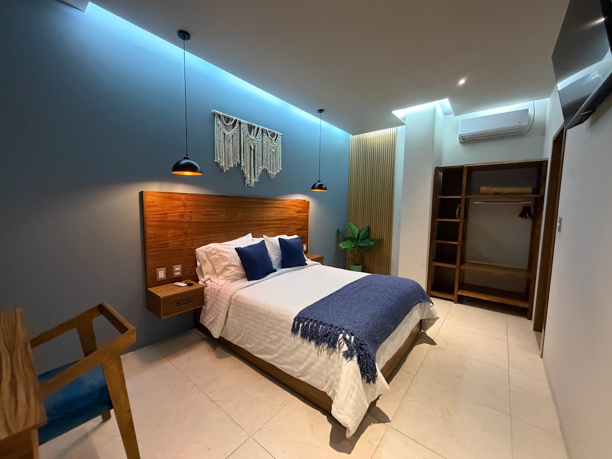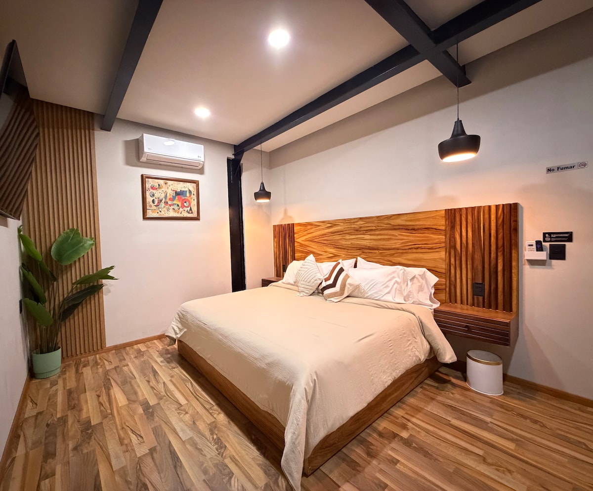 LA PRIMA is perfect for singles or new lovers, its practical and comfortable design leaves space to rest and/or work. It has access to our patio and reception desk. - 19m2 - Queen size bed, with bedding made of bamboo. - Boulenc breakfast. - Indoor bathroom with shower. - Handmade and organic bathroom amenities made in Mexico. - Free WiFi. - Safety deposit box. - Work desk.