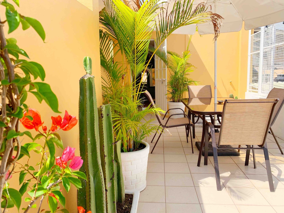 Rustic upstairs studio in a 17th c. old bldg. Its colonial style and many plants keep the heat off during the hottest months making the room a bit dark- but you'll have a sunny terrace. Culture, food, shops within walking distance. Nothing like staying in a centric place and be able to stay out late in a very safe zone! 60Mbps internet A dog and a cat live in the property. Medical offices at the front of the house. Please read our house rules before booking. Not fit for babies/children/pets.