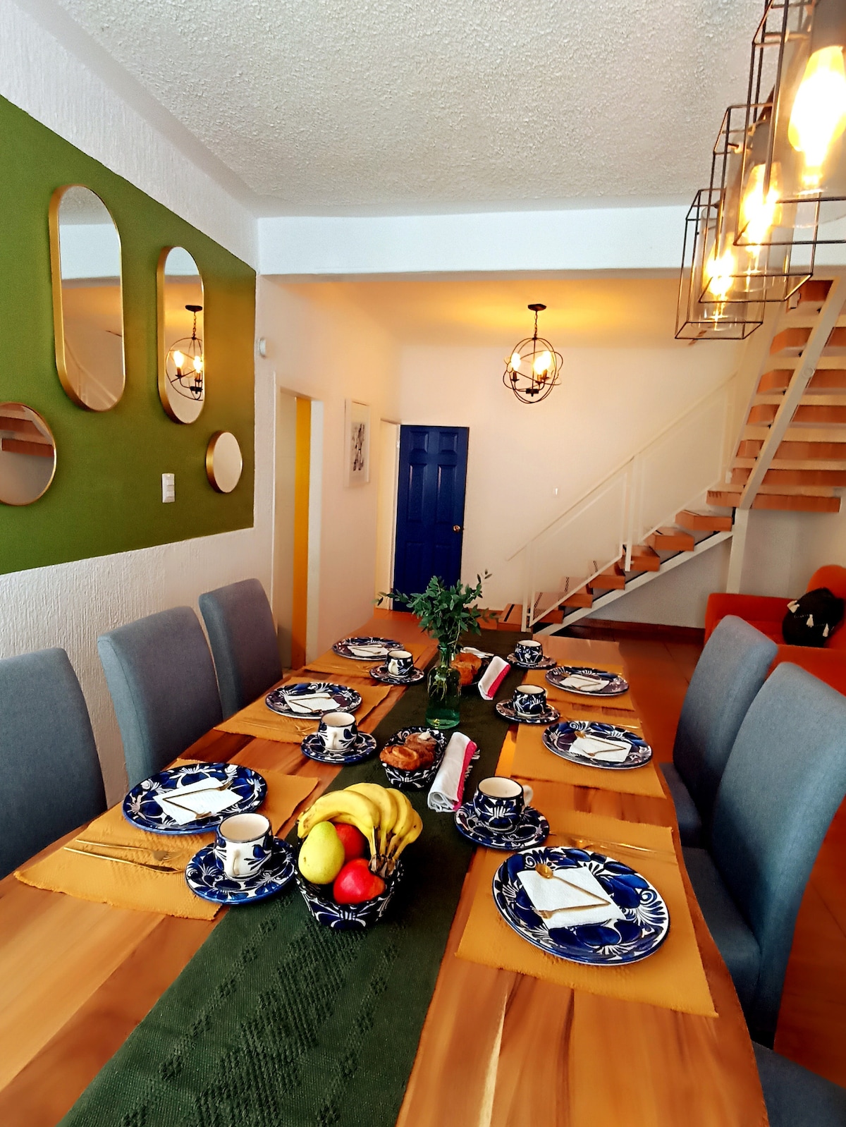 É um pequeno apartamento localizado a 5 minutos do centro histórico da cidade de Oaxaca de carro, onde você pode desfrutar de privacidade em família ou em casal, tem espaços comuns e estacionamento próprio com portão automático, o interior do apartamento é vestibulado por uma sala de jantar e cozinha, altura dupla e janelas amplas, seus dois quartos têm uma cama de casal e uma poltrona-cama para um hóspede extra, além de um banheiro privativo em cada andar.