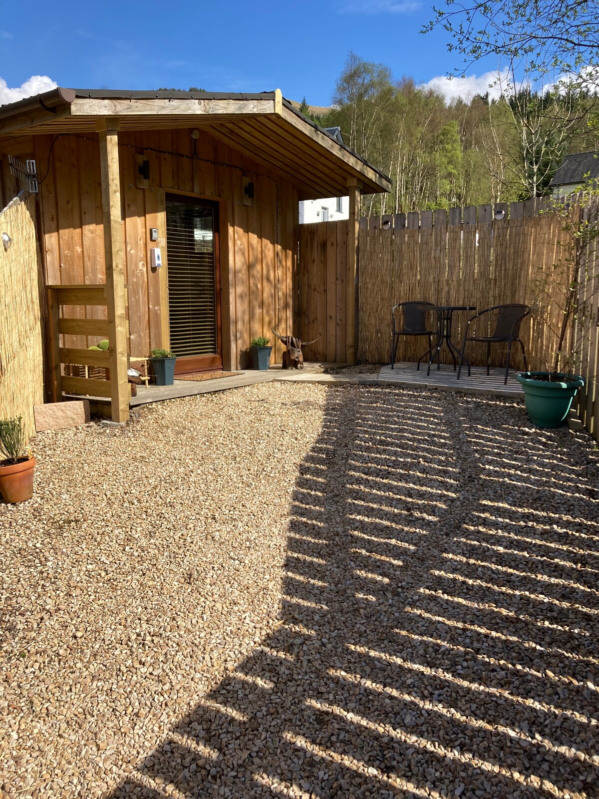 Acomodação de luxo com uso exclusivo da banheira de hidromassagem privativa. Inclui café da manhã leve, além de chá e café no quarto. O retiro contemporâneo com sua própria entrada privativa e área de convés está localizado com vista para o riacho Allt a 'Chaorach. O interior elegante inclui móveis vintage, janelas do chão ao teto e piso de madeira recuperado. O quarto da suíte tem uma cama king-size, chuveiro e geladeira para bebidas. Totalmente aquecido para uso no inverno e uma porta de pátio para conforto no verão.