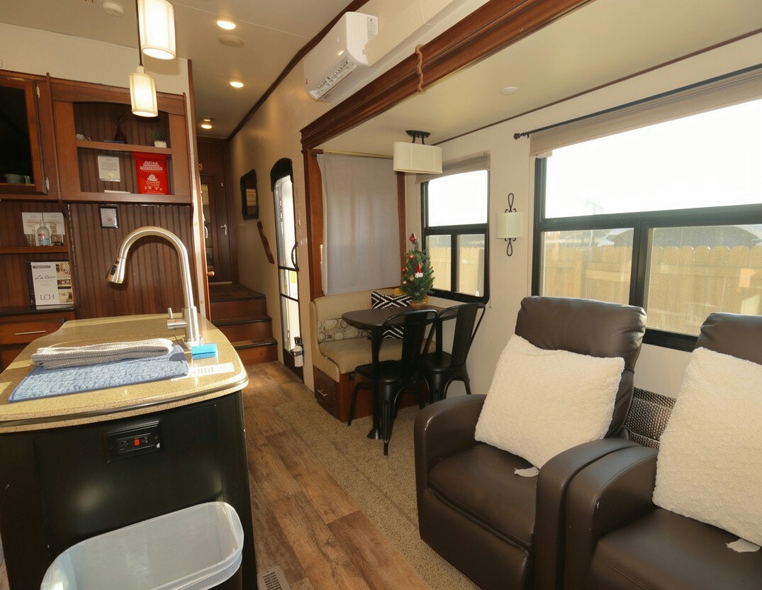 Retiro aconchegante de trailer com lareira, chaminé e churrasqueira ao ar livre, perfeito para casais ou profissionais que querem paz sem perder a conveniência. • Sistema de som doméstico e Smart TVs • Em propriedade privada • Cozinha e lareira elétrica • Lareira e churrasqueira • Máquina de lavar e secar roupa no local