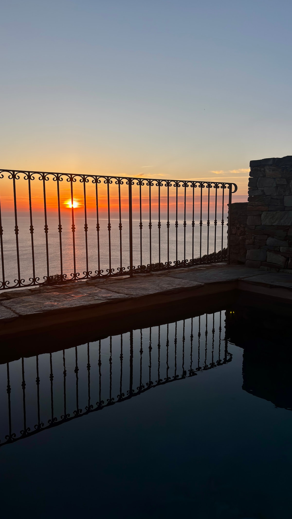 Residência de pedra entre o mar, a montanha e a piscina.