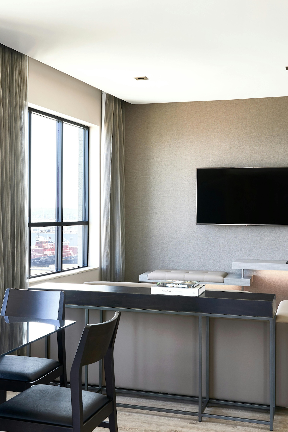 Desfrute de uma noite tranquila em nossas exclusivas camas de plataforma "flutuantes", completas com portas de carregamento convenientes e roupas de cama luxuosas. Nossos quartos de inspiração minimalista são cuidadosamente projetados para fornecer todos os itens essenciais que você precisa - e nada que você não precisa - durante a sua estadia em Portland.