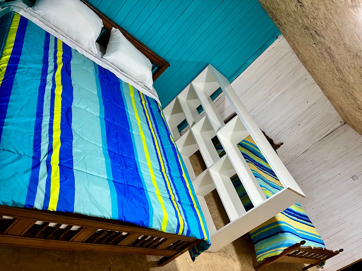 Suíte de hóspedes rústica, com vista para a floresta e para o mar.