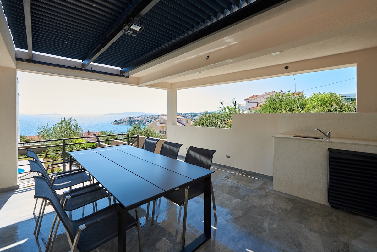 A Villa A'More é uma elegante vila privada à beira-mar com uma piscina aquecida e vistas deslumbrantes para o mar. Perfeito para famílias ou amigos, oferece conforto, privacidade e uma atmosfera mediterrânea relaxante. Explore as cidades próximas de Trogir e Split, da UNESCO, ou desfrute de praias, terraço e piscina — sua escapada perfeita no Adriático.