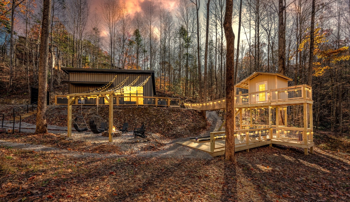 Cabana moderna com casa na árvore, banheira de hidromassagem e sauna