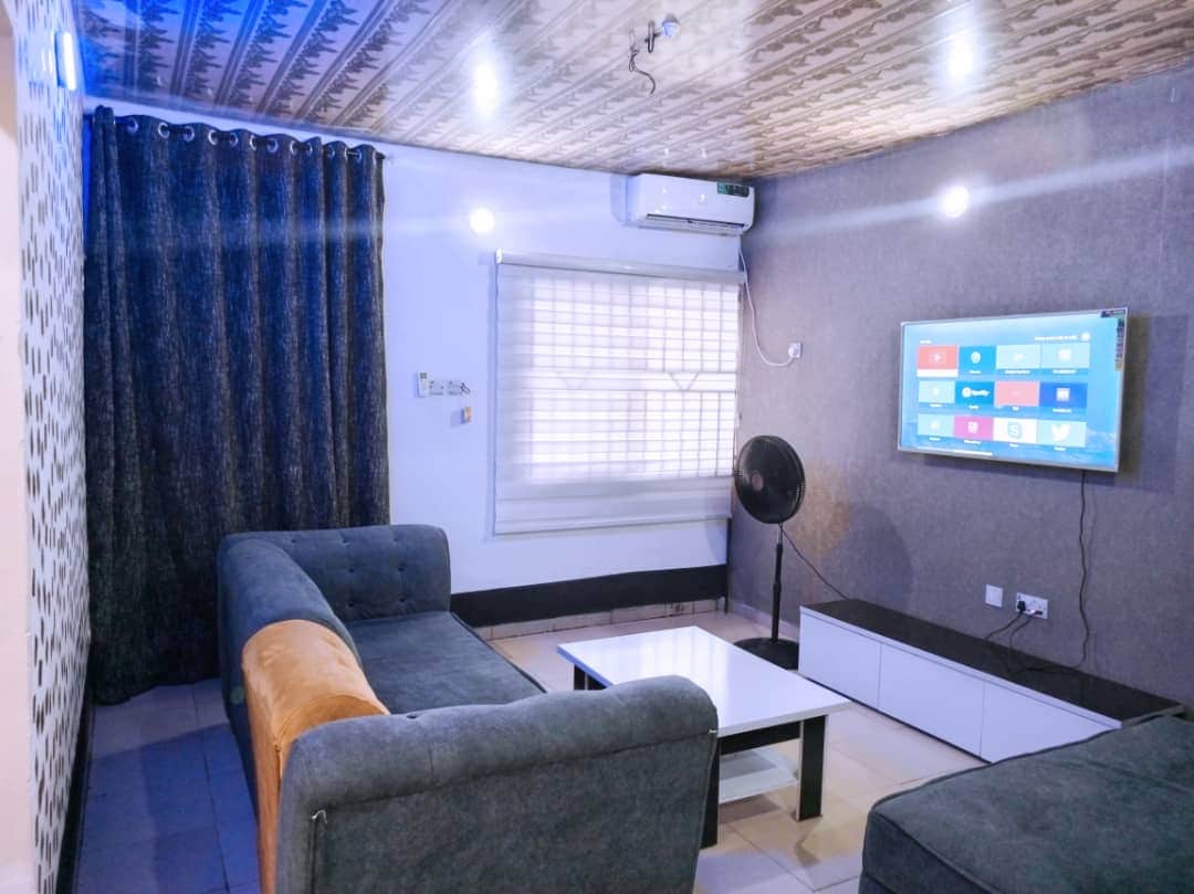 Um apartamento de 2 quartos bem construído em um ambiente repositório não muito longe do aeroporto com estrada asfaltada por todo o aeroporto para o edifício principal e também de alagbaka para o edifício principal com as seguintes características : Amplo espaço de estacionamento Unidade de ar condicionado central para sala de estar eventiladores para quartos Ambiente Condusivo do gerador em espera Smart TV de 50 polegadas Sofá moderno Fogão a gás e forno Retirada de carro do aeroporto/outras solicitações de serviço especial