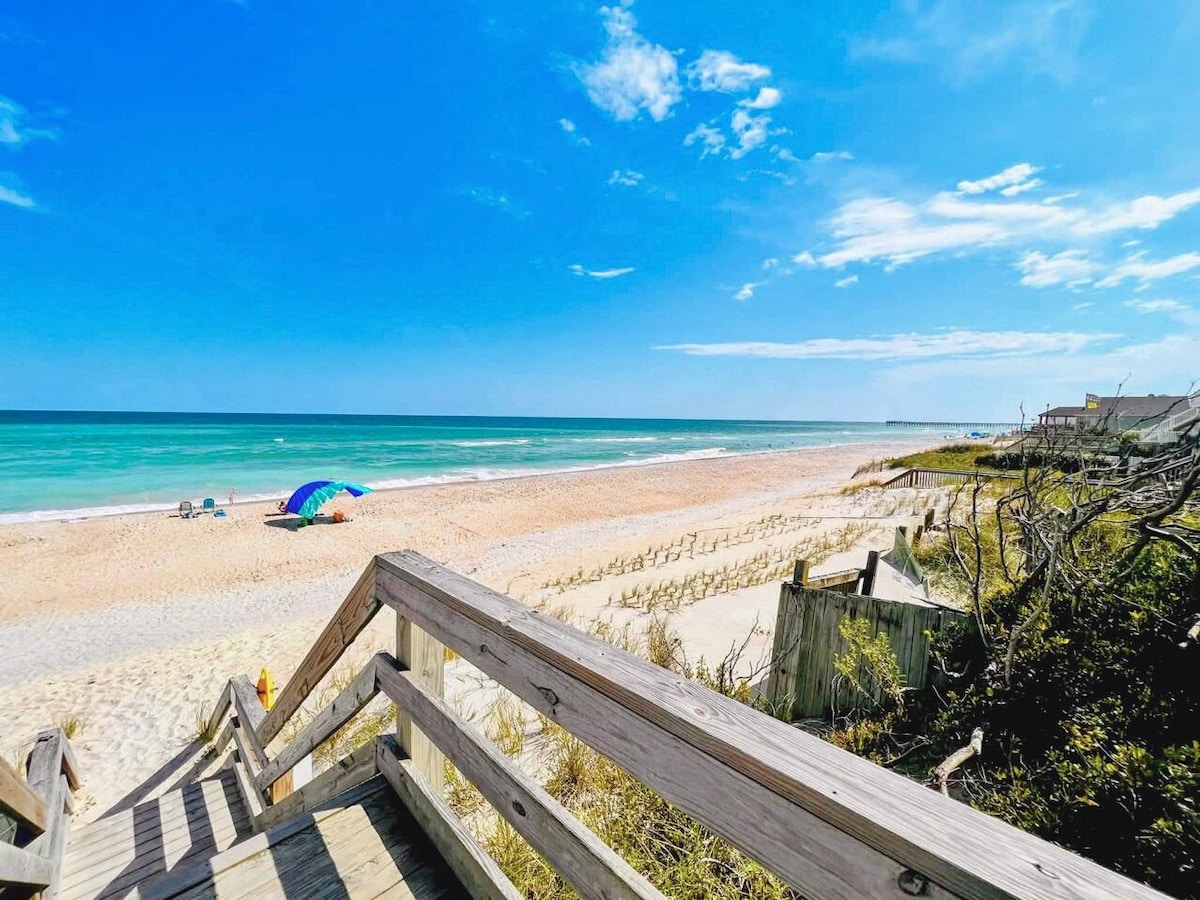 Localizada no centro de Surf City, e a uma curta distância do píer, restaurantes, cafés, bares de vinhos, esta requintada casa de canto de 3 quartos e 3 banheiros oferece conforto e conveniência. A apenas 150 metros do Beach Access 11, você desfrutará de vistas para o mar a partir dos decks da frente e vistas tranquilas para a Intracoastal Waterway a partir da parte de trás. Com todas as comodidades, até mesmo algumas extras que você não sabia que precisava, este é mais do que apenas um lugar para ficar... é um lugar para realmente relaxar e descontrair.