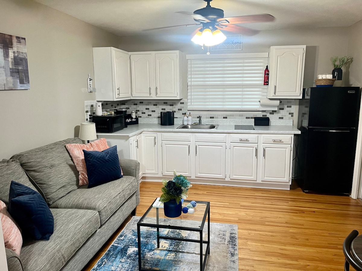 Relaxe e relaxe neste espaço calmo e elegante. Desfrute da privacidade desta unidade recentemente renovada, que inclui uma cama queen size e uma pequena sala de estar com um sofá-cama, para que o espaço possa acomodar confortavelmente até três pessoas. Também está incluída uma TV inteligente de 50 polegadas, cozinha pequena, banheiro/chuveiro, armário e fechadura com teclado numérico para facilitar o acesso. Tenha em mente que temos uma câmera de segurança externa na frente para melhorar sua segurança. Convenientemente situado a 1 milha da Highway 295.