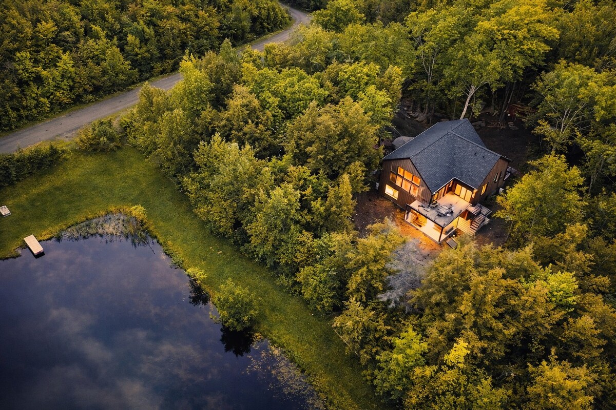 Conceito aberto monumental, no coração da natureza. Acesso a trilhas diretamente atrás da casa. Fogão a lenha, banheiro amplo e moderno, um quarto + sofá-cama. Outro sofá-cama na sala de estar. Chalé ideal para casal com filhos ou dois casais. Amantes de aves selvagens, perus e veados, sejam bem-vindos! Wi-Fi e carregador de veículos elétricos incluídos. Cães são bem-vindos! CITQ : #308038
