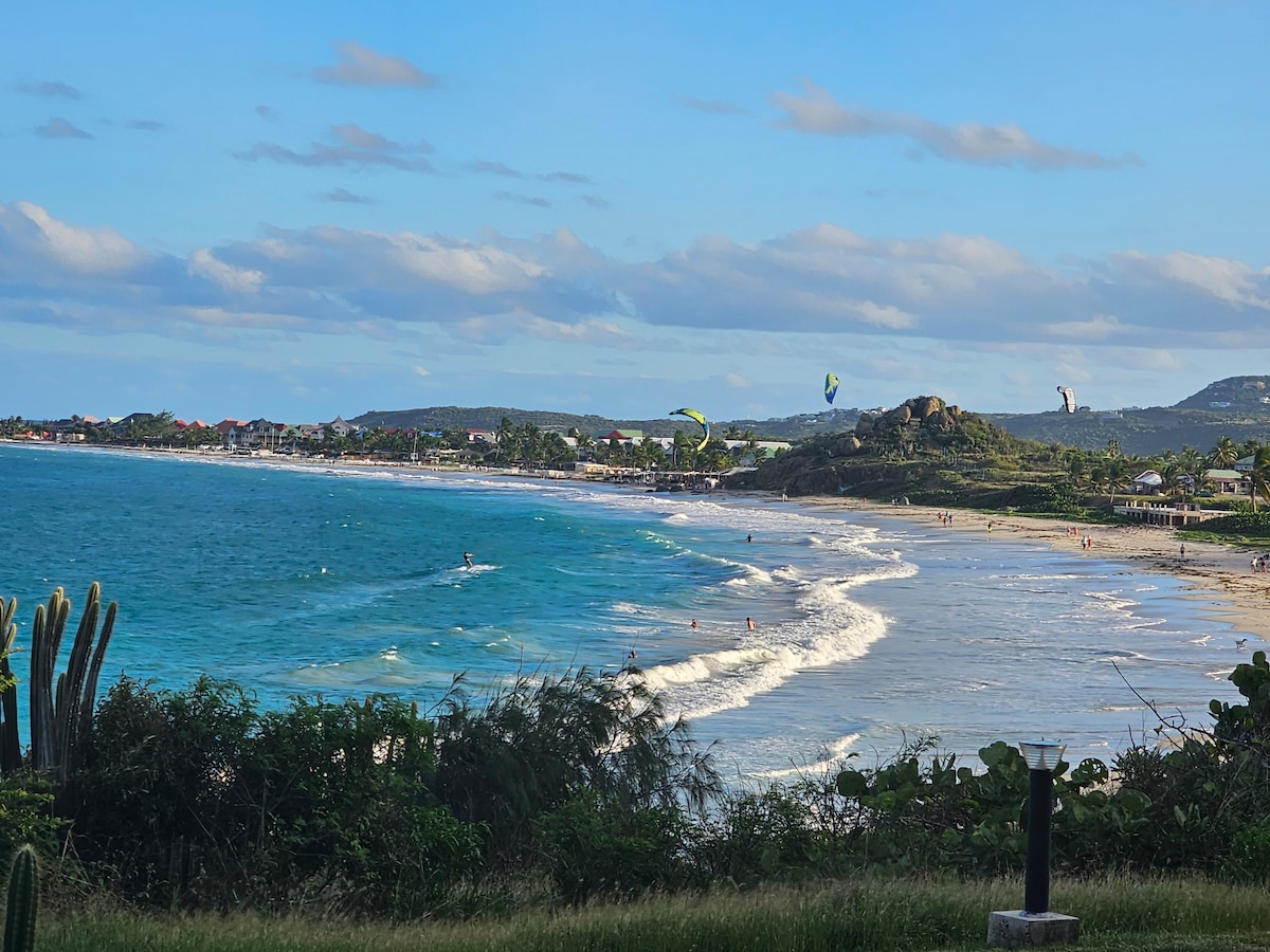 Apartamento com vista para o mar totalmente renovado (2021-2022), idealmente localizado a poucos passos do centro da famosa praia de Orient Bay. WI-FI de alta velocidade. Através de apartamento com um terraço de cada lado e mesmo andar (raro) que lhe permite ter nascer e pôr do sol e também ar que circula por todo o apartamento. 2 sofás grandes, incluindo 1 sofá-cama, uma cozinha totalmente equipada com máquina de lavar louça e máquina de lavar roupa. O piso superior com um segundo quarto está desbloqueado para reserva com um mínimo de 3 pessoas