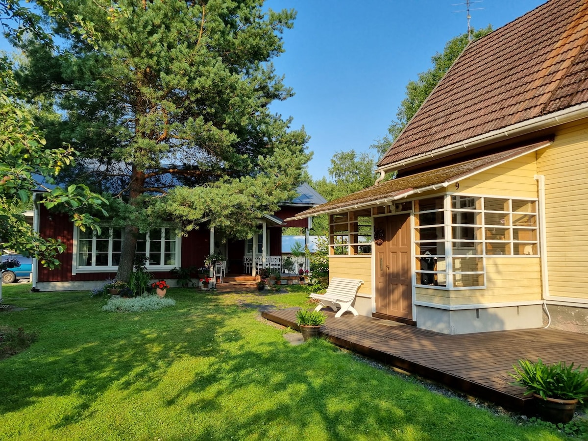 Tervetuloa maaseudun rauhaan! Villa Muusa tarjoaa värikästä majoitusta enintään 8 hengen seurueille (parhaan asumiskokemuksen saamiseksi suosittelemme että näistä on aikuisia max. 6). Vanhaan navettaan on kunnostettu ihana puusauna ja suihkutilat. Saunan terassilla Beachcomber-ulkoporeallas (vuokra 150€). <b>Omat petivaatteet ja pyyhkeet mukaan! Bring your own bed linen and towels!</b> Peitot ja tyynyt löytyvät talon puolesta, kuten myös saippuat ja wc- sekä talouspaperit. Ig @villamuusa