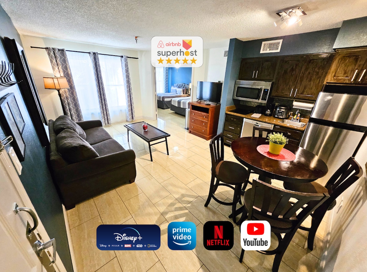 Entre em nosso apartamento recém-remodelado e aconchegante de 3 quartos, projetado com famílias em mente e a poucos minutos do encantamento da Disney! Situado em uma área tranquila e semi-florestal, oferece o refúgio perfeito para relaxar e recarregar as energias após um dia cheio de diversão nos parques. Desfrute de todos os confortos modernos em um espaço lindamente atualizado com toques elegantes por toda parte. Relaxe junto à piscina em estilo resort, prepare uma refeição nas áreas de piquenique com churrasqueira a carvão ou relaxe sob guarda-sóis.