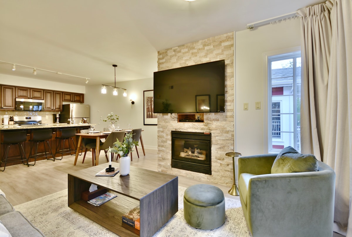 Situado no topo do Vale Horseshoe, este apartamento deslumbrante e único prepara o terreno para uma viagem memorável e aconchegante. Esta suíte tem tudo! - Cozinha totalmente abastecida - Mesa de jantar para 6 pessoas - Sofá extraível + namoradeira + espreguiçadeira - Lareira aconchegante - Cama king-size confortável - Banheira de imersão para 2 pessoas + chuveiro - Varanda privativa - Piscina interna/externa aberta o ano todo com banheira de hidromassagem e sauna - Academia totalmente equipada A poucos minutos do Vetta Spa, Horseshoe Valley, campos de golfe e muito mais!