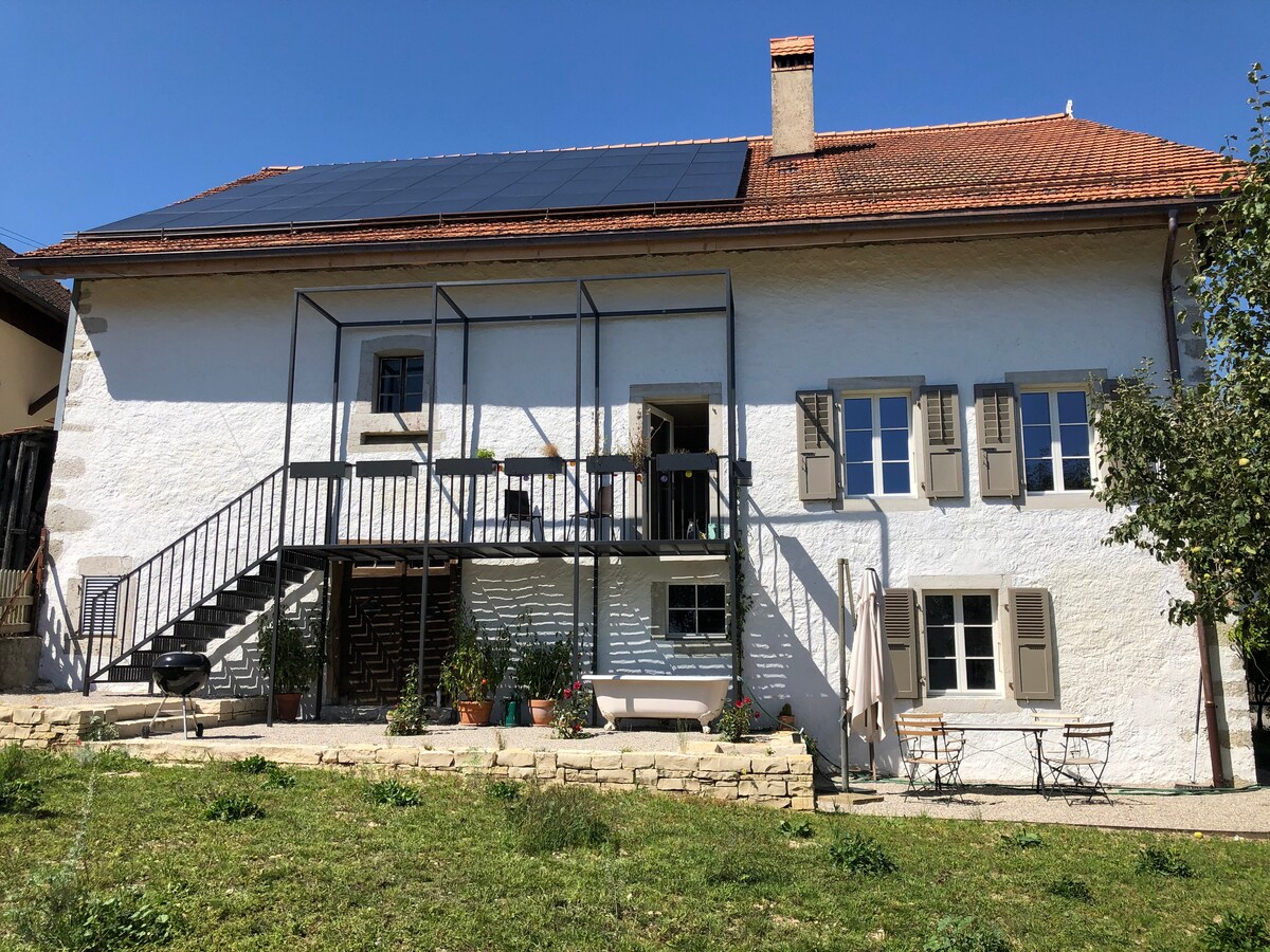 No 1º andar de uma casa de família (os proprietários vivem no térreo) no campo: vista soberba para os Alpes Berneses. Convenientemente localizado na região dos 3 Lagos: Neuchâtel, Biel e Murten (praias equipadas). Estacionamento gratuito, cozinha totalmente equipada, fogão a lenha na sala de estar, lavanderia. Área de jantar + churrasqueira no jardim. A 10 minutos a pé da estação. De Carro: 15 minutos de Papillorama 20 minutos de Bienne 20 minutos de Neuchâtel 30 minutos de Berna 30 minutos de Friburgo Caminhadas, ciclismo, natação, mercado agrícola.