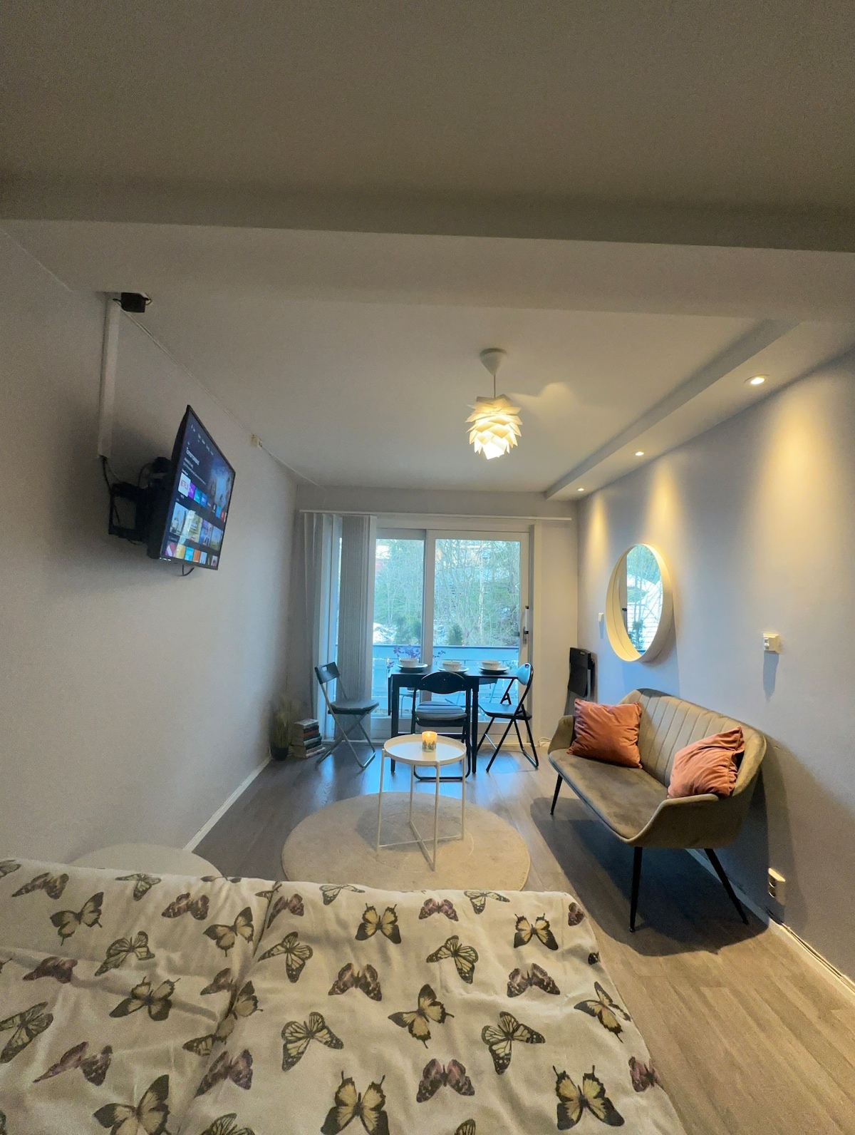 Lys og trivelig 1-roms leilighet med kjøkkenkrok. Inneholder dobbeltseng og sovesofa. Kjøkkenet har kjøleskap/fryseskap, koketopp, stekeovn, mikrobølgeovn og oppvaskmaskin. Stort og lyst flislagt bad med gulvvarme. Inneholder toalett, servant og dusjhjørne. Leiligheten ligger i garasjebygg på bakkeplan. Egen terrasse med sol på ettermiddagen. Det finnes også mulighet for å leie en grillhytte som finnes på eiendommen. Har 2 sykler som er mulig å leie (5EUR per dag) Gode parkeringsmuligheter.