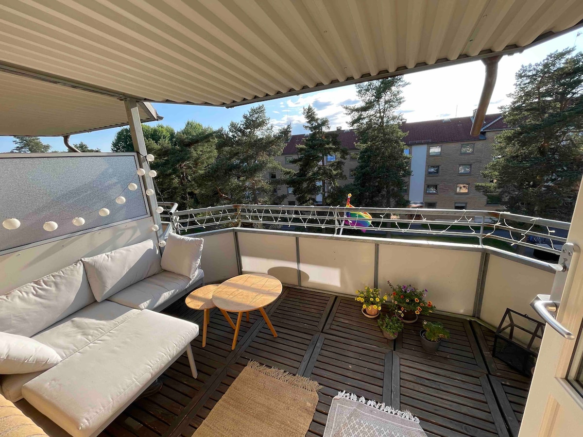 Fin og moderne leilighet med fult kjøkken som er godt utstyrt. Flott og romslig bad, med dusj og vaskemaskin. Soverom med 160 cm dobbeltseng. Mulighet for overnatting på sovesofa i stuen for en person (barn under 12 år to personer). Fin uteplass. Leilighet ligger nær t-bane (3 minutter) og gratis gateparkering. T-banen bruker 18 minutter til sentrum. Flere dagligvarebutikker ligger 600m unna. Kort vei til skog og mark, med innsjøer man kan badet i. På vinteren kan man gå på ski og skøyter.