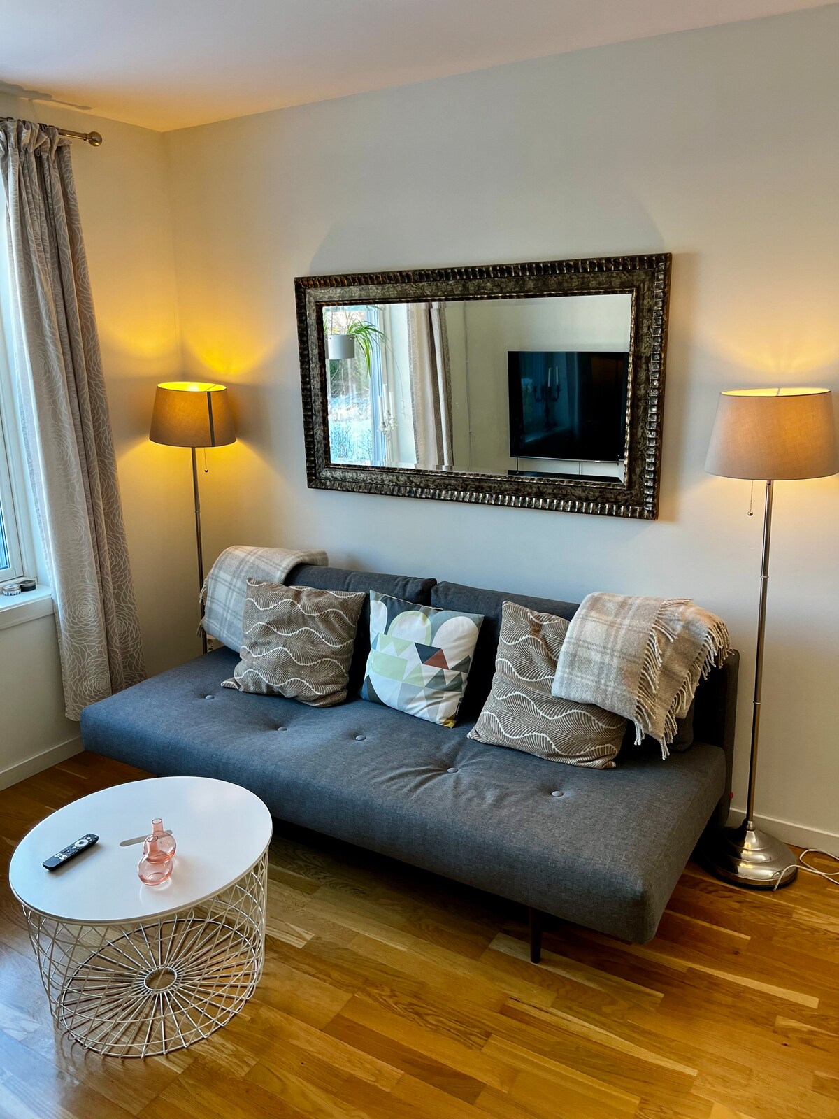 Fin og moderne leilighet med fult kjøkken som er godt utstyrt. Flott og romslig bad, med dusj og vaskemaskin. Soverom med 160 cm dobbeltseng. Mulighet for overnatting på sovesofa i stuen for en person (barn under 12 år to personer). Fin uteplass. Leilighet ligger nær t-bane (3 minutter) og gratis gateparkering. T-banen bruker 18 minutter til sentrum. Flere dagligvarebutikker ligger 600m unna. Kort vei til skog og mark, med innsjøer man kan badet i. På vinteren kan man gå på ski og skøyter.