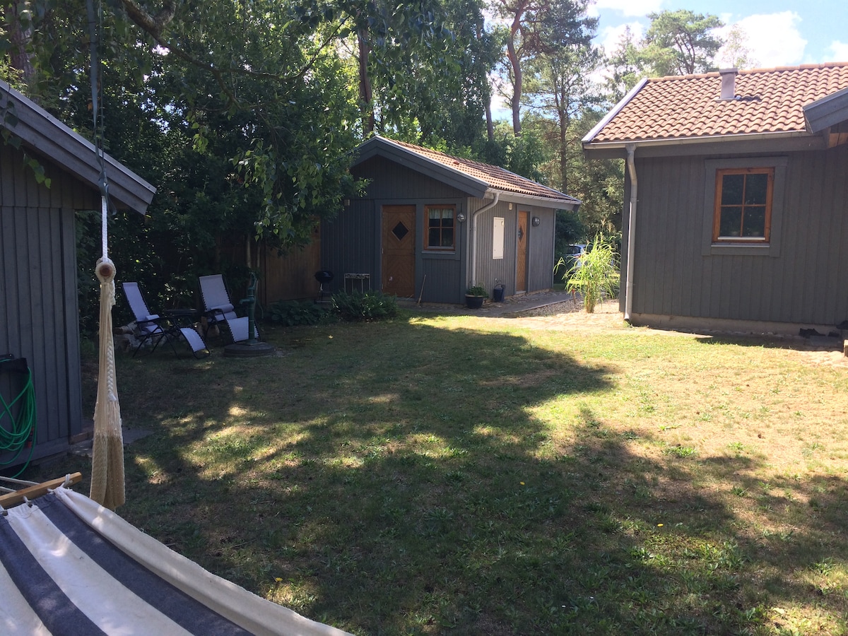 Litet hus med stor fruktträdgård i Östra Hoby. På en bakgata i byn med trevliga grannar kring sig men fri utsikt mot hästhagar. 5 km till Borrby Strand. 15m2 hus, våningssäng 80 x180 cm. Möjlighet att bädda med madrasser på golv. Är man fiffig med bäddande och humöret kan en familj få plats och trivas. Gå barfota ut på det stora trädäcket. Utedusch. Kallt vatten i huset, varmt vatten på toa och i dusch. Lakan ingår och handduk om man behöver. Frukt och bär till frukostbehov.
