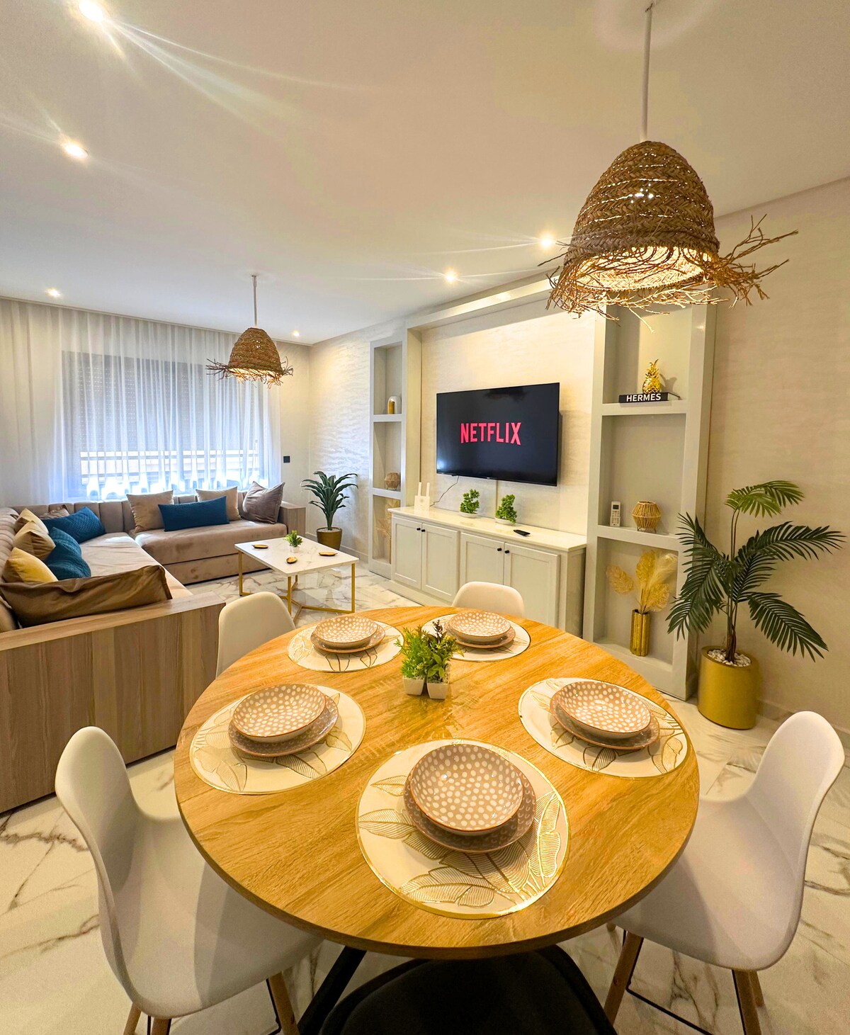 Experimente a elegância com o toque marroquino no luxuoso lugar de Marraquexe (La Palmeraie). Rodeado por palmeiras, você pode desfrutar de: - Sofá moderno que pode ser convertido em uma cama de casal - Quarto elegante com colchão premium - Smart TV Wi-Fi, Netflix e IPTV - Cozinha totalmente equipada - Banheiro grande - Terraço com vista panorâmica para desfrutar de cafés da manhã e suas pausas. A residência oferece uma piscina muito grande, jardim grande e estacionamento gratuito no local