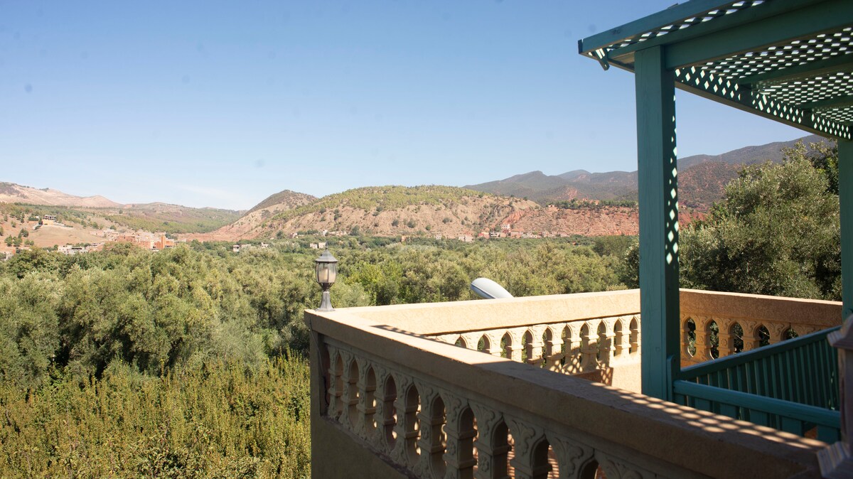 Suíte temática vermelha com vista extraordinária sobre o pôr do sol e a bela Cordilheira do Atlas. Vem com uma cama de casal e de solteiro. Um banheiro com chuveiro/banheira e duas opções de cama de solteiro disponíveis, se necessário. O quarto em si é muito espaçoso e você não vai esquecer a vista da varanda!