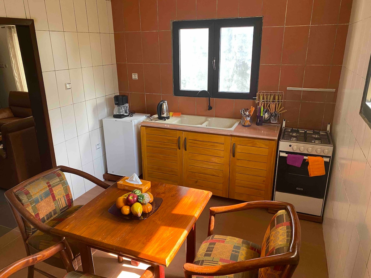O apartamento fica em um pequeno prédio de 4 apartamentos localizado perto do cruzamento Bélier em Cotonou, tem dois quartos com banheiro privativo com chuveiro e todo o conforto: TV via satélite, cozinha equipada com geladeira, fogão, micro-ondas. Os chuveiros têm água quente. Um terraço está disponível para refeições ao ar livre. P.S.: A eletricidade é cobrada do inquilino através de um medidor de cartão. (Prever cerca de 50 € por 30 dias, dependendo do uso... ar condicionado ou não)