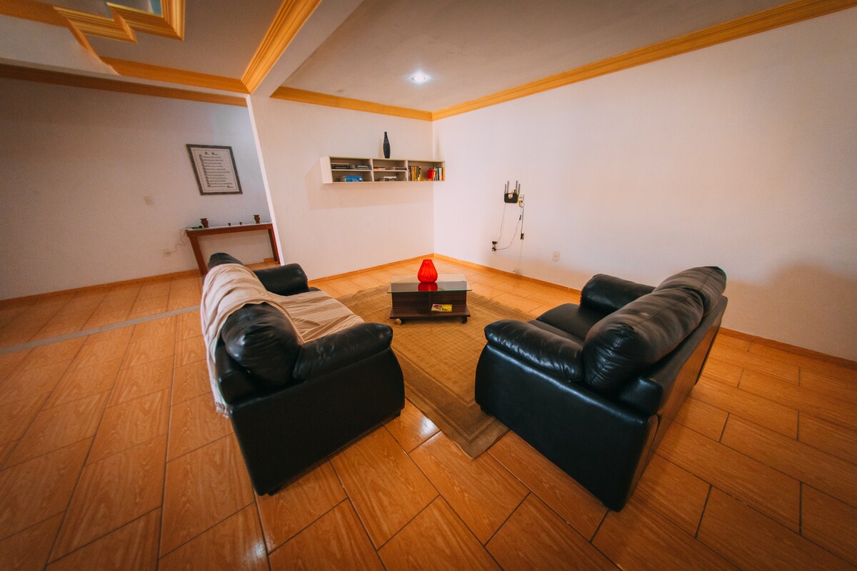 Suíte temática da pedra Topazio (terceiro chakra), climatizada de conforto superior, projetada para acomodar até 3 hóspedes em 1 cama queen + 1 cama solteiro (até 3 adultos ou 2 adultos e 1 criança).