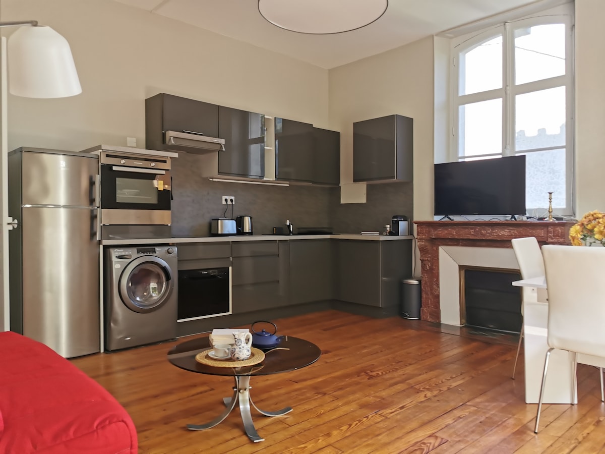Localizado no coração de Pau, perto de todos os comércios, no 1º andar de um pequeno edifício do século XIX, o apartamento dispõe de uma bela cozinha aberta, totalmente equipada para que você possa fazer suas refeições. Sala de estar aconchegante com um grande sofá-cama, TV panorâmica, área de escritório. Quarto agradável, cama queen size, closet. Banheiro e toalete separados. Com exposição ao sul, você desfrutará de uma vista deslumbrante dos jardins escondidos do centro histórico de Pau. Apartamento para não fumantes, mesmo na varanda.