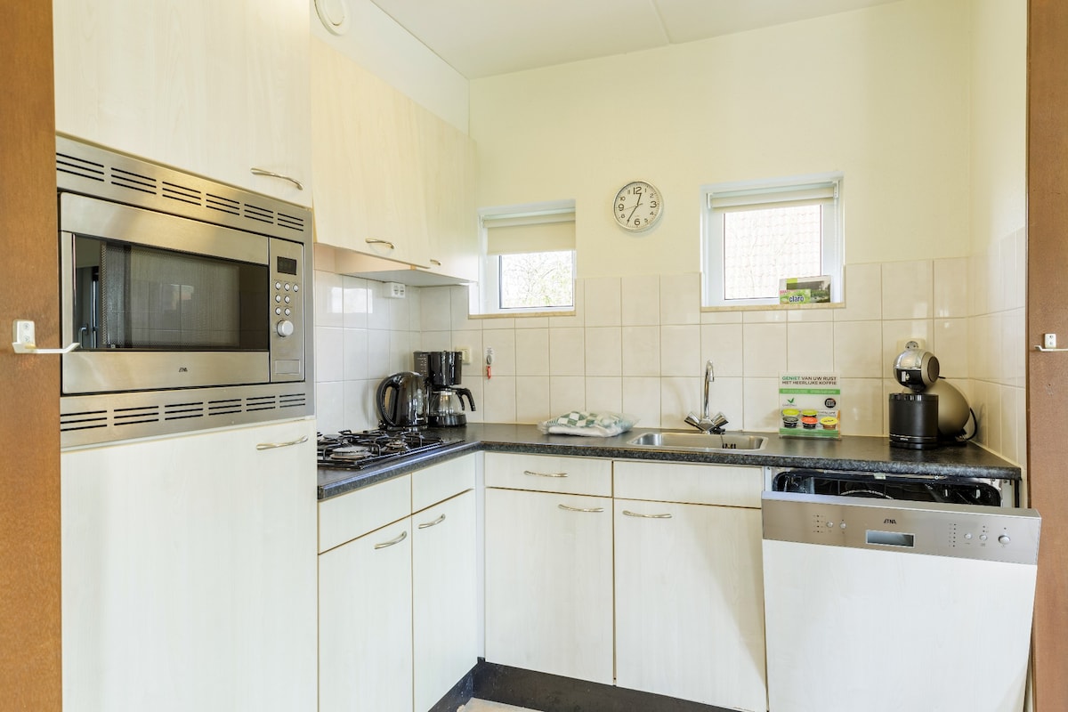 Uma casa de campo na floresta, em um resort de férias. Wi-Fi incluído. Tem uma cozinha bem equipada, um banheiro com chuveiro e vaso sanitário e dois quartos. A sala de estar tem um sofá-cama de casal. Portas francesas se abrem para um terraço parcialmente coberto. Há também um grande jardim com vários terraços e muitas espreguiçadeiras para desfrutar do sol ou da sombra. No terraço principal, que é parcialmente coberto, uma mesa grande. O parque tem uma piscina interna que você pode usar. Transporte público nas proximidades.