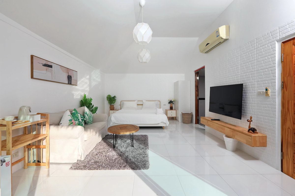 O novo estúdio de luxo de 45㎡ oferece um retiro tranquilo com acabamentos premium e confortos modernos. Desfrute de decoração inspirada em pandas🐼, varanda privativa com vista para o jardim🌿 e piscina de borda infinita no terraço com vista deslumbrante para o Mar de Andaman🌅. Mantenha-se conectado com Wi-Fi de alta velocidade 📶 e smart TV. Localizado em uma área segura, tranquila e livre de tsunamis, a apenas 8 minutos da praia 🏖️ e a 2 minutos de lojas, restaurantes, salões de massagem e bares - perfeito para um refúgio tropical relaxante.
