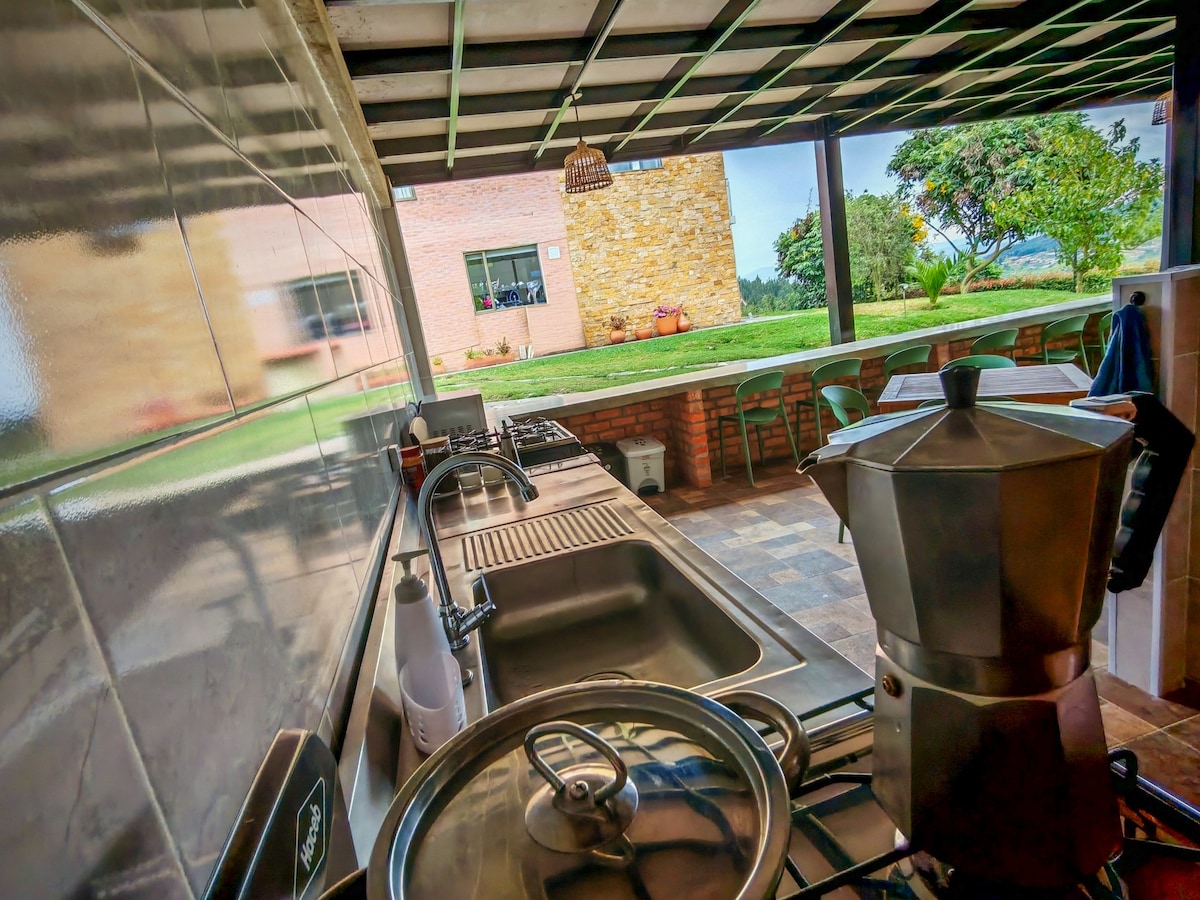 Hacienda campestre los Zipas Casa de campo mobiliada com excelente layout de espaços, 5 quartos, kitchenette, kitchenette, kitchenette, 2 banheiros sociais, 2 banheiros sociais, 2 banheiros privados, 2 banheiros privativos, sala de estar e jantar muito espaçosa, lareira, TV de 59 ", e directv, varanda, terraço, coberto, parque coberto. Rodeada por jardins, áreas verdes, natureza, cercada por montanhas, excelentes vistas para as montanhas, florestas e para a cidade. Possibilidade de serviços adicionais de banho turco e churrasco.